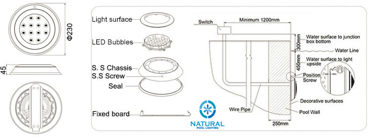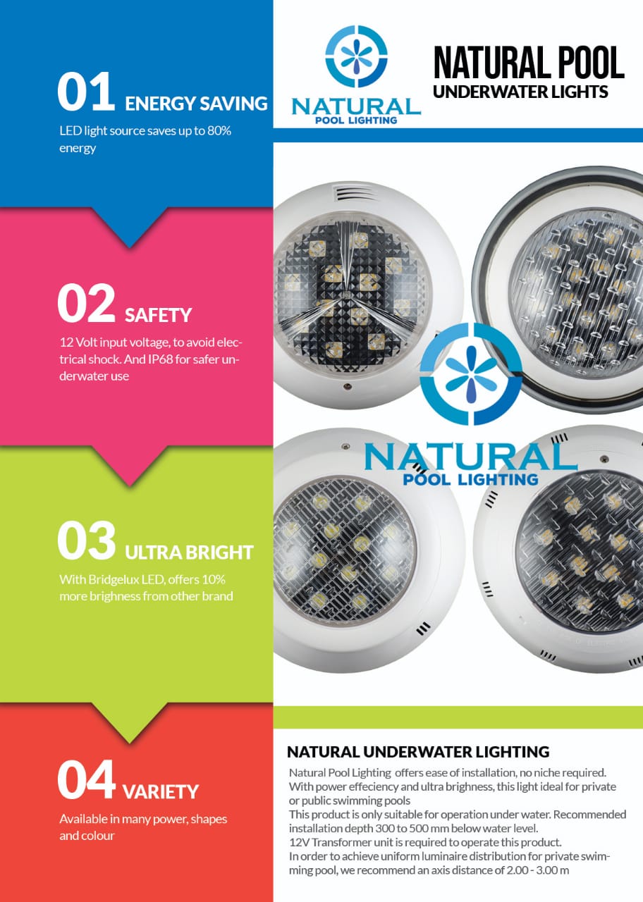 Tersedia dalam 2 versi, yaitu versi LED 12 Watt dan Halogen 75 Watt. Seperti umumnya lampu kolam renang, lampu ini beroperasi pada tegangan 12V, sehingga memerlukan transfomer, Informasi transformer bisa dilihat disini